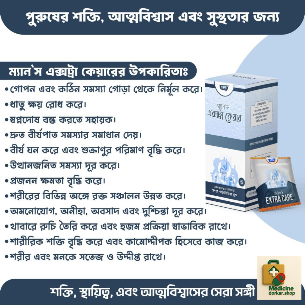 আপনি কি গোপন দূর্বলতায় ক্লান্ত? পুরুষের জন্য ইহা একটি মারাত্মক সমস্যা। অনেক সময় পরিবারে, দাম্পত্য জীবনে অশান্তি এবং মানসিক চাপ সৃষ্টি করে। অনেক সময় পুরুষরা লজ্জায় এই সমস্যা আড়াল করেন তখন পরিবারে জটিলতা বেধে যায়। ফিরিয়ে আনুন পুরুষত্বের আসল শক্তি। তাই এই সমস্যা থেকে চিরতরে মুক্তি পেতে সেবন করুন আমাদের প্রাকৃতিক ও ন্যাচারাল ফুড সাপ্লিমেন্ট ” ম্যান’ স এক্সটা কেয়ার”।